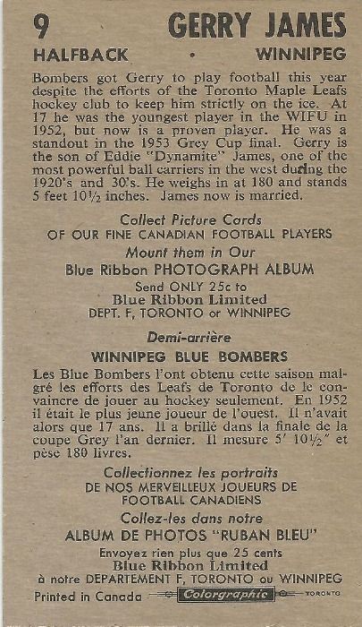 Gerry "Kid Dynamite" James passed away on 13 February 2024 on the very same day as former teammate Kenny Ploen. James was born in Regina, Saskatchewan on 22 October 1934 but attended Kelvin High School in Winnipeg. But in 1952 he joined the Winnipeg Blue Bombers professional football team as a running back at the tender age of seventeen(!) thus becoming the youngest player in CFL post-WWII history. He played at both halfback and fullback, returned kickoffs and punts and also kicked for the Blue Bombers over a ten year stint from 1952-62. (He missed the 1956 and 1963 seasons due to injury.) He played one more year in 1964 as a RB and kicker for the Saskatchewan Roughriders.