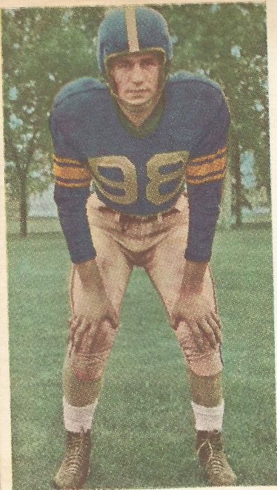 But he also played hockey at the highest levels after the Blue Bomber season ended! He was with the Winnipeg Monarchs when they lost in the Memorial Cup (junior championship) final in 1951 and was then transferred to the Toronto Marlboros with whom he celebrated a Memorial Cup championship in 1955. He then played 154 regular season games from late 1955 to the end of the 1959-60 season for the Toronto Maple Leafs of the NHL as well as 15 playoff games. He scored a total of 14 goals for the Leafs in the regular season and one more in the playoffs. The Maple Leafs had tried to get him to play only hockey but they weren't willing to make up the salary he was getting from the Blue Bombers and he was better at football anyway. The Maple Leafs only valued him as a "policeman" which in more modern parlance is a goon or enforcer. As a result the Leafs had him with the Rochester Americans of the AHL for part of the 1957-58 season and the Winnipeg Warriors of the WHL for the duration of the 1960-61 season.