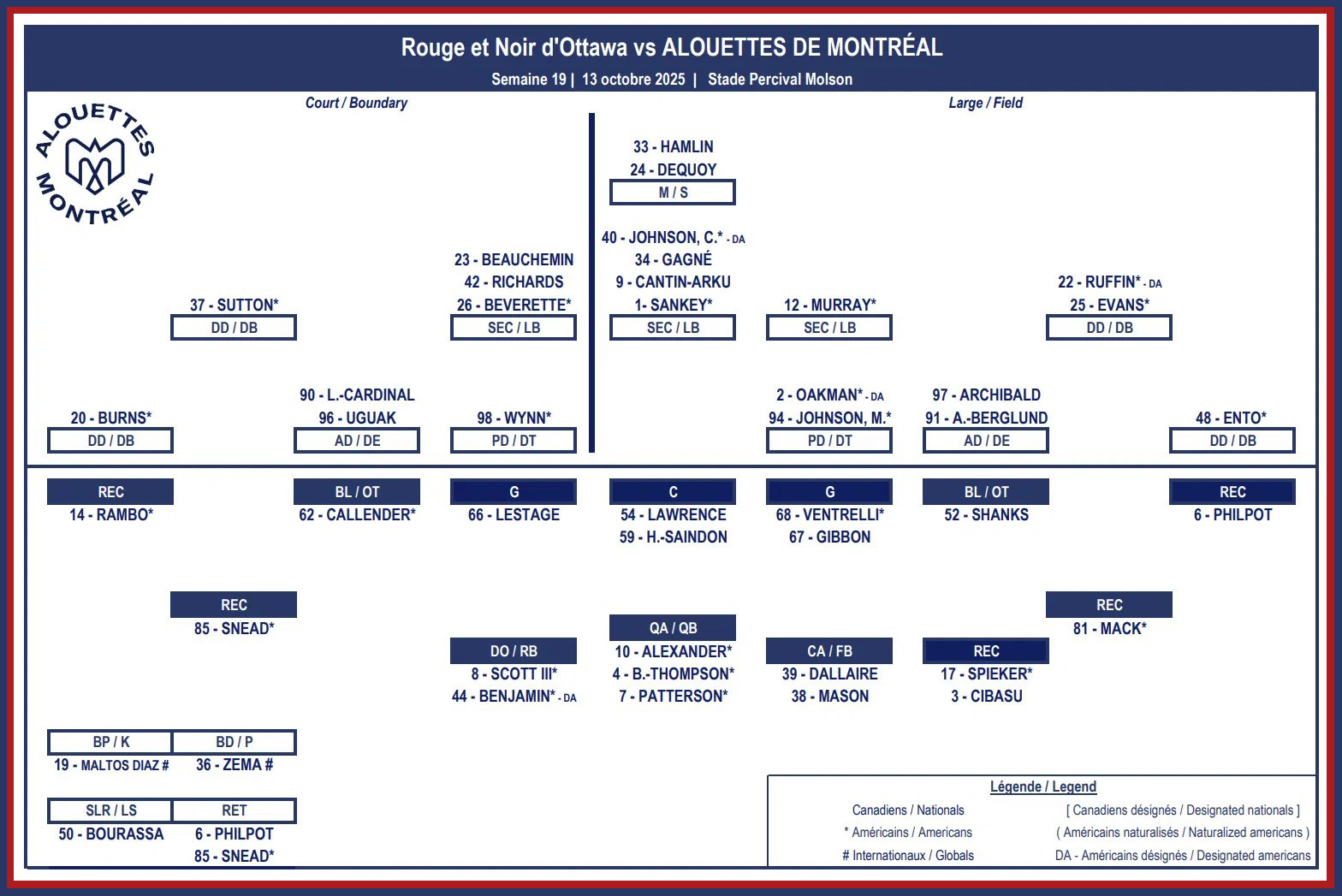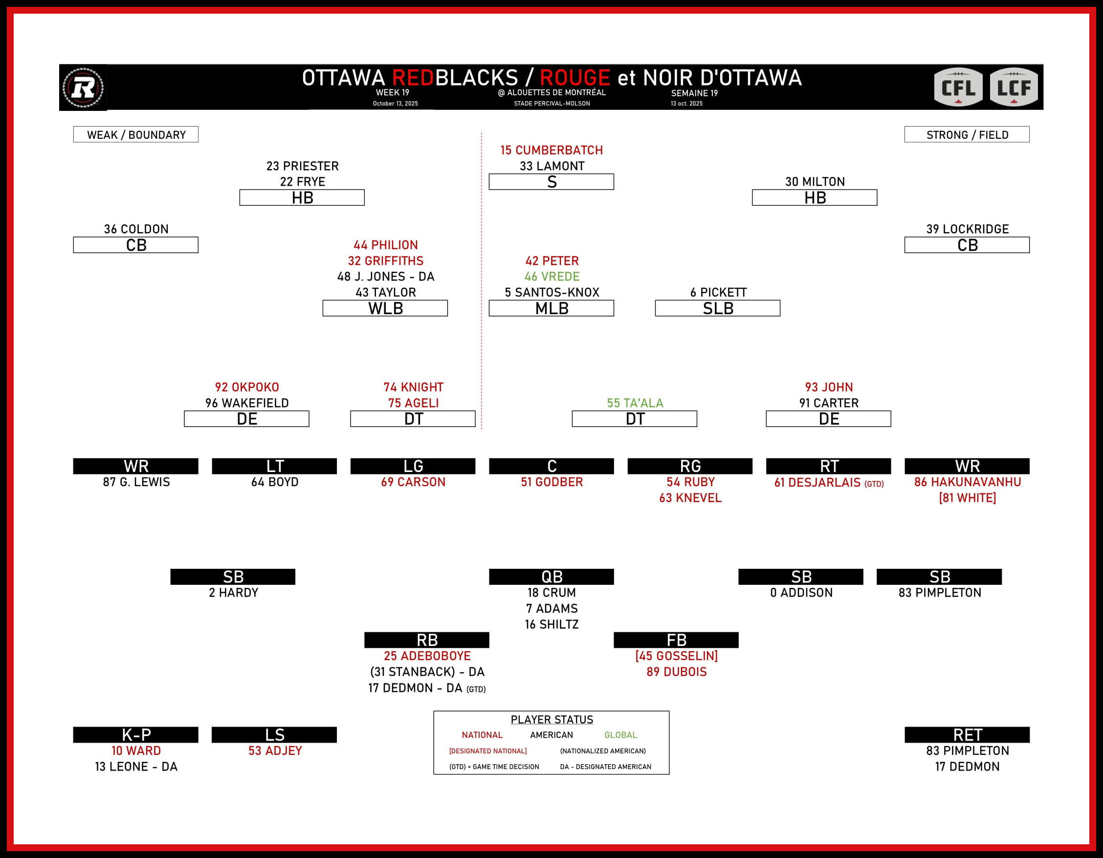 Defensively, Ottawa will be missing a couple of key starters due to injury in safety Bennett Williams (knee) and weakside linebacker Lucas Cormier (head). Other depth pieces sitting out include American defensive end Chase McGowan (calf), Canadian defensive end Kene Onyeka (hamstring), and Canadian safety Charlie Ringland (quad). American linebacker Jamie Pettway and Canadian defensive back King Ambers have been returned to the practice squad.