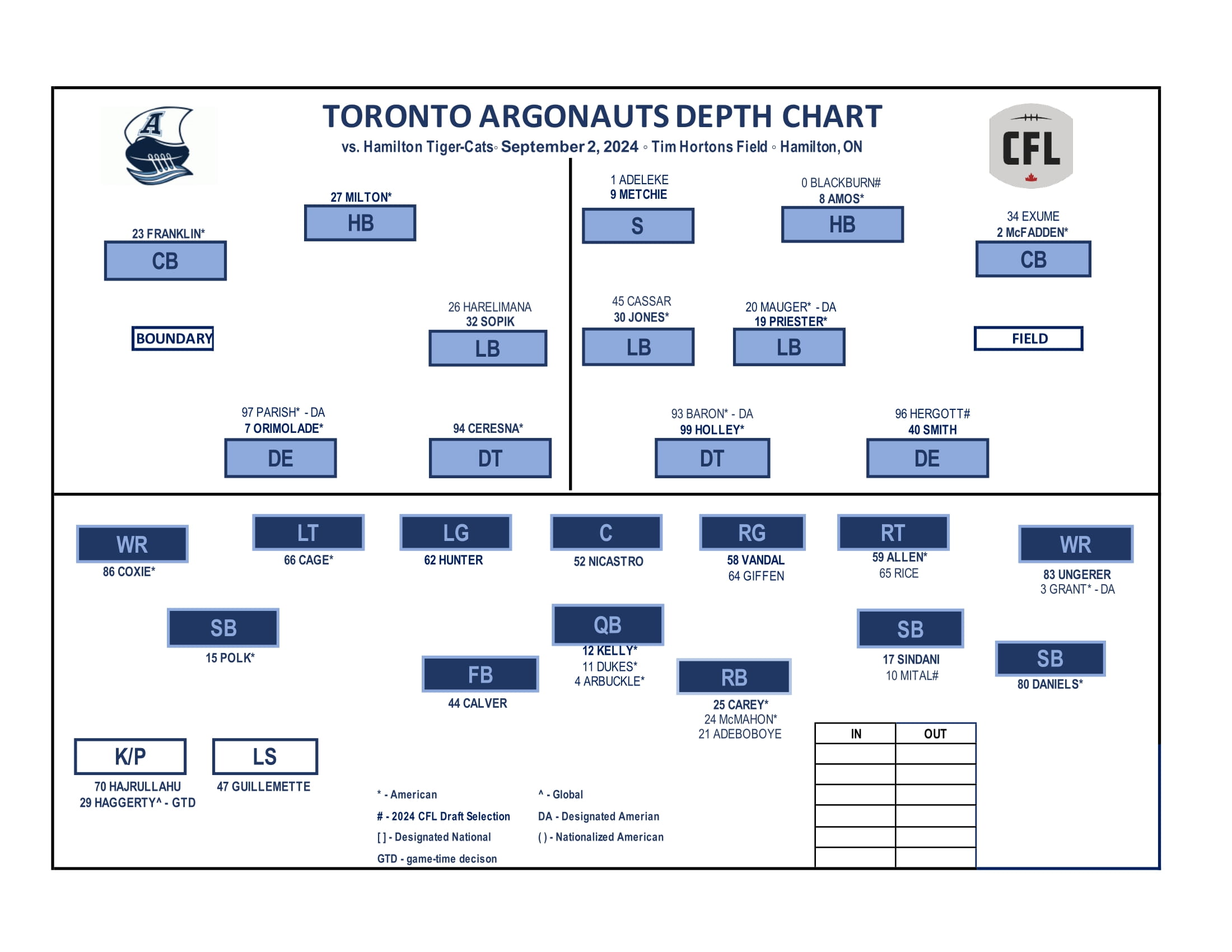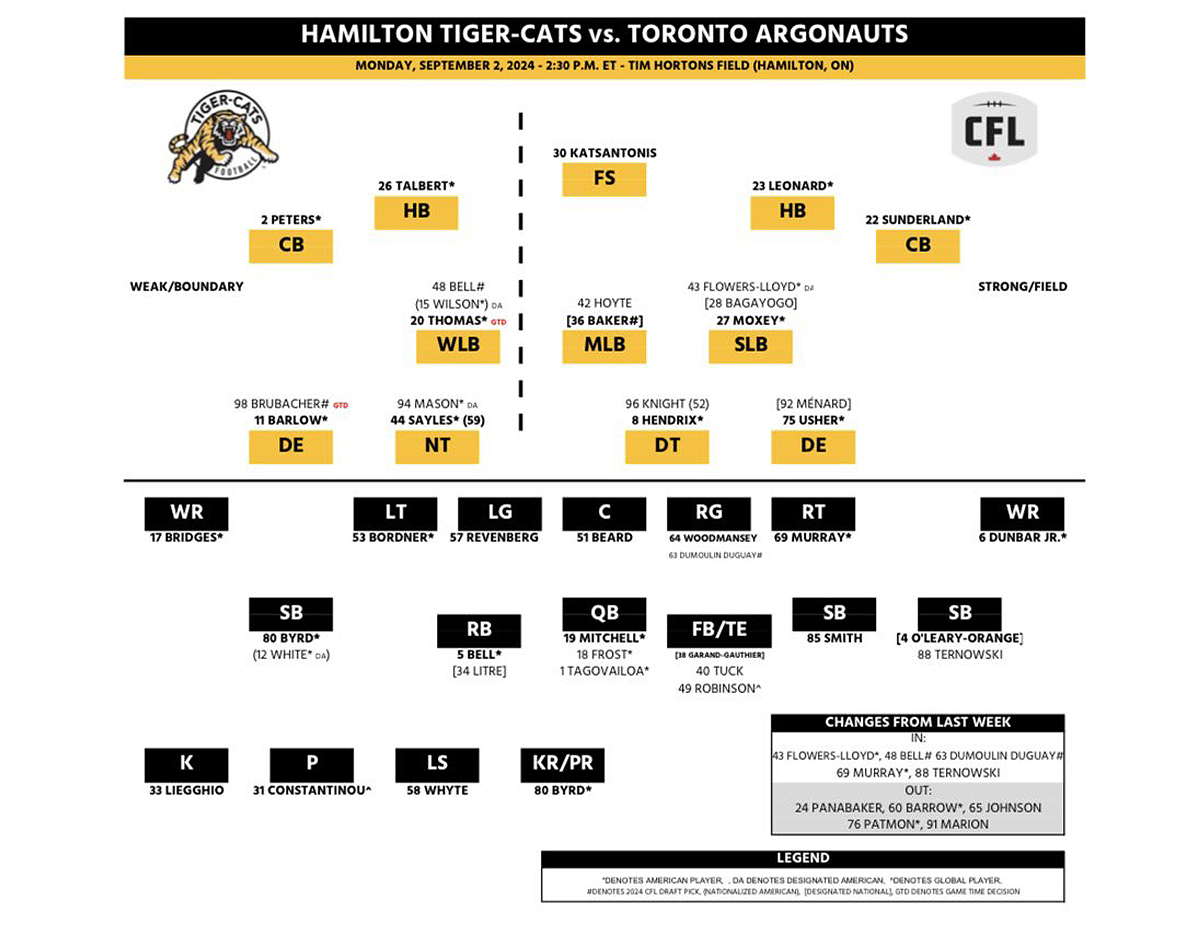 Other depth pieces returning to the lineup include Canadian receiver Tyler Ternowski, rookie linebacker Daniel Bell, and 2024 first-round offensive lineman Nathaniel Dumoulin-Duguay. Sitting down for the QEW rivalry are Canadian defensive back Robert Panabaker, offensive lineman Evan Johnson, and defensive lineman Benoit Marion, as well as American receiver Dezmon Patmon.