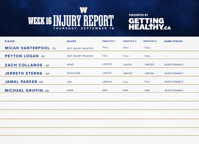 Winnipeg has made two other changes two other changes to the roster, placing defensive backs Nick Hallett and Michael Griffin II on the one-game injured list. Hallett, who has recorded six special teams tackles over 10 games this year, is uninjured, according to the team's official report, while Griffin II missed practice all week due to a knee injury.
