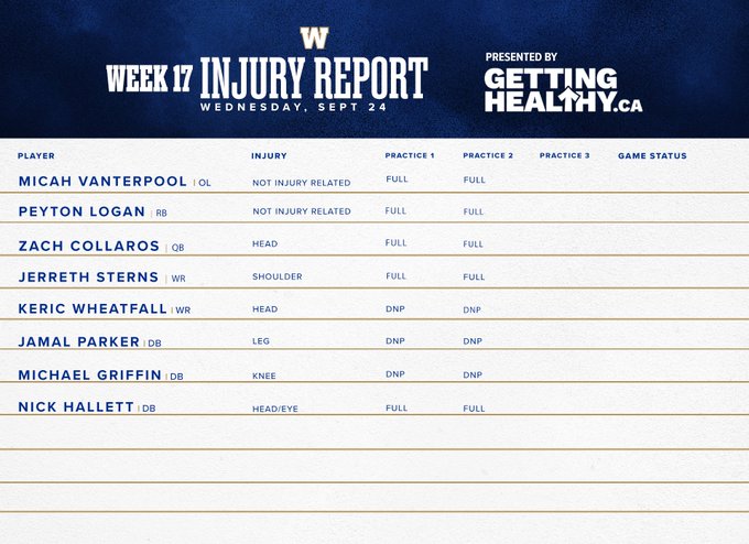 Quote from: Blue In BC on September 24, 2025, 09:21:15 PMIt's looking pretty certain that Parker and Griffin will both be out this week. Wheatfall is certainly going to be out.