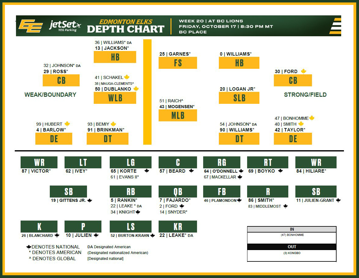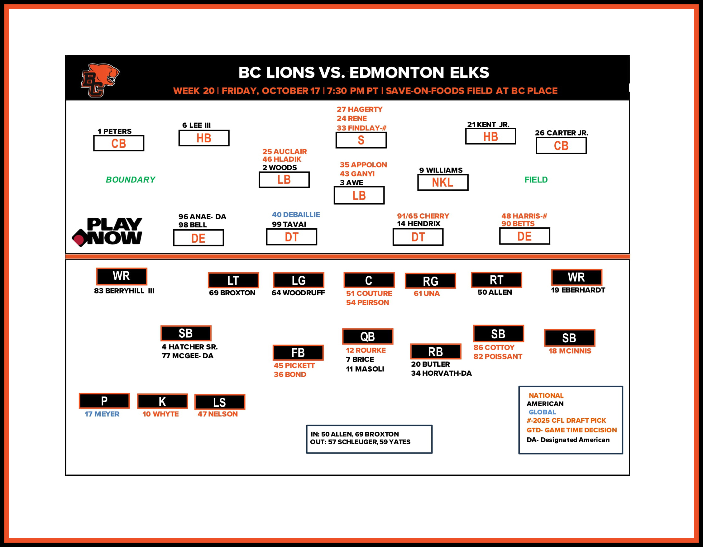 The lone change to the lineup is the loss of Canadian defensive lineman Jonathan Kongbo, who has been ruled out with a rib injury. The 29-year-old has recorded six defensive tackles and a career-high four sacks in 16 games since joining the Elks. He will not get a chance to rekindle his acquaintance with a Lions organization that he was briefly a part of in 2023, before being released and claiming the team did not have a winning culture.