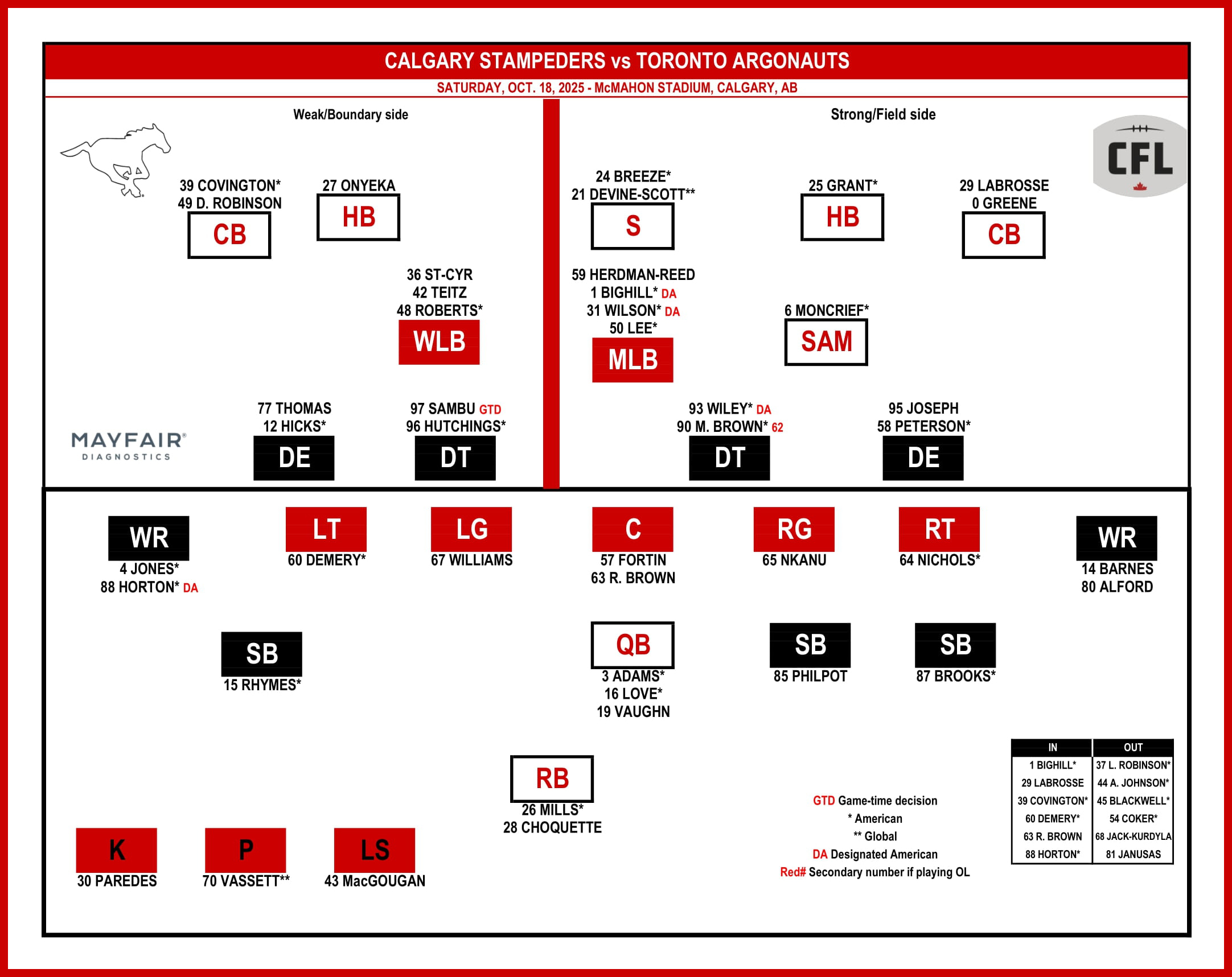 Global Bailey Devine-Scott will start his second game in the middle, with Canadian journeyman Godfrey Onyeka filling in at boundary halfback after making several starts at cornerback earlier this season. Undrafted Canadian rookie Dolani Robinson gets the surprise start at boundary corner despite former first-round CFL Draft pick Ben Labrosse coming off the injured list, though American Jacobe Covington could rotate into that spot in his first career game, depending on how the team manipulates its ratio in-game.