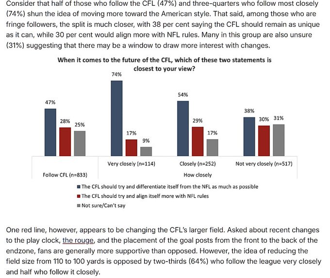 In other words the people who are CFL fans, who follow the game closely/very closely (the ones that are most likely to buy tickets, and merchandise), nearly 3/4 of the respondents say "the CFL should try and differentiate itself, from the NFL as much as possible."