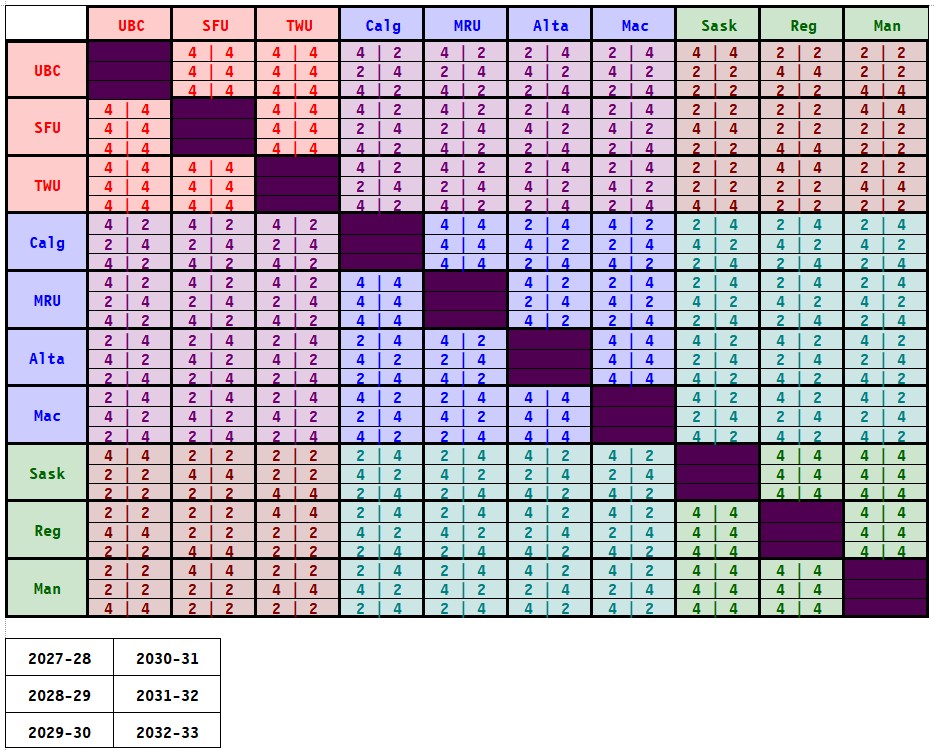 For the 2027-28 season, you look at the number in the upper left box. So for Regina, they would play four games against Trinity, Alberta, MacEwan, Saskatchewan, and Manitoba (the first five and last five series on their schedule, though not necessarily in that order) and two games against each of UBC, Simon Fraser, Calgary, and Mount Royal (which would be the middle four series on their schedule).