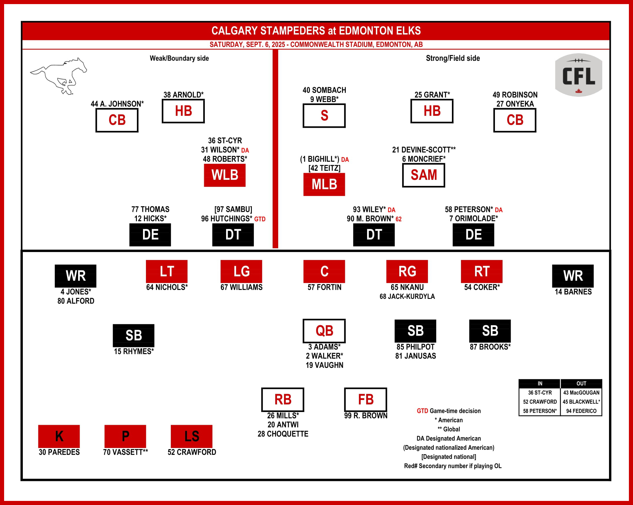 The Stampeders have also added Canadian defensive back Kaylyn St-Cyr and American defensive lineman Shaun Peterson Jr. to the active roster this week, both of whom were promoted from the practice roster. St-Cyr has made 15 special teams tackles over 13 career CFL regular-season games, while Peterson Jr. has made one defensive tackle, four special teams tackles, and one sack over two career games.