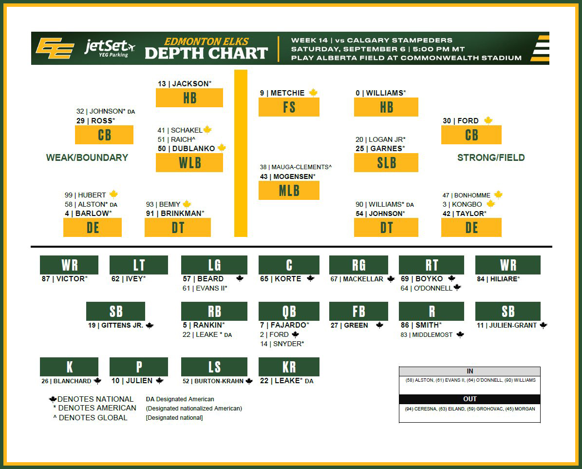 The weather forecast in Edmonton calls for a high of 27 degrees with a mix of sun and cloud. The game will be broadcast on TSN in Canada and CFL+ internationally. Radio listeners can tune-in on 770 CHQR in Calgary and 880 CHED in Edmonton.