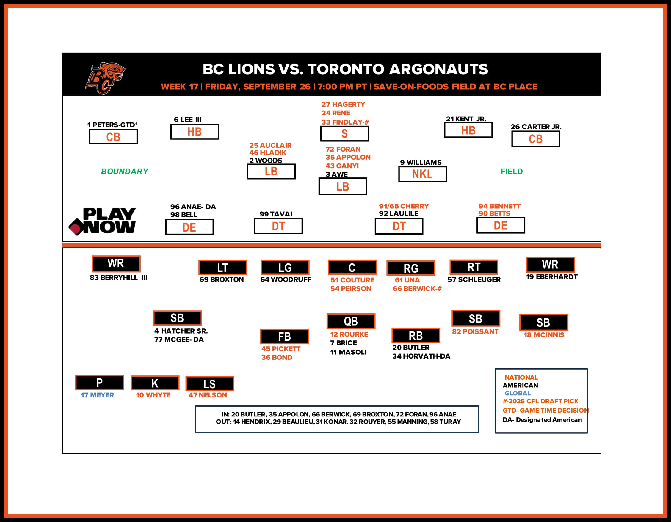 Bradlee Anae will replace the recently released Kemoko Turay in the defensive end rotation, while defensive tackle DeWayne Hendrix will sit out due to illness. Canadian linebacker Adam Konar (elbow) has been placed on the six-game injured list, and Global linebacker Maxime Rouyer (hip) will be on the one-game injured list, as newly signed Canadians Woodly Appolon and Cam Foran make their debuts as depth pieces on special teams.