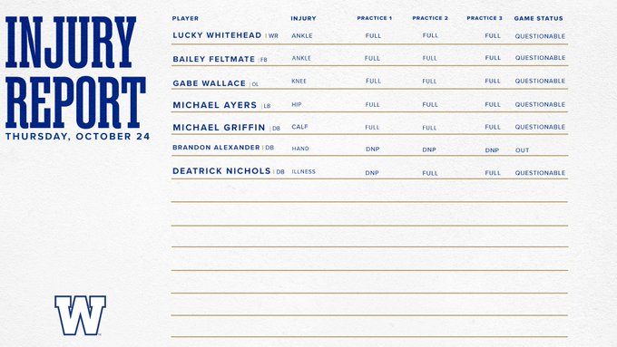 Joining him back in the linebacking corps after a one-game absence is backup SAM Michael Griffin. Fullback Bailey Feltmate is also back from a long injury to add to the special teams unit. Depth players sitting out as a result are American defensive back Tyrique Mcghee, American linebacker Bryce Notree, Canadian linebacker Max Charbonneau, and Global linebacker Fabian Weitz.