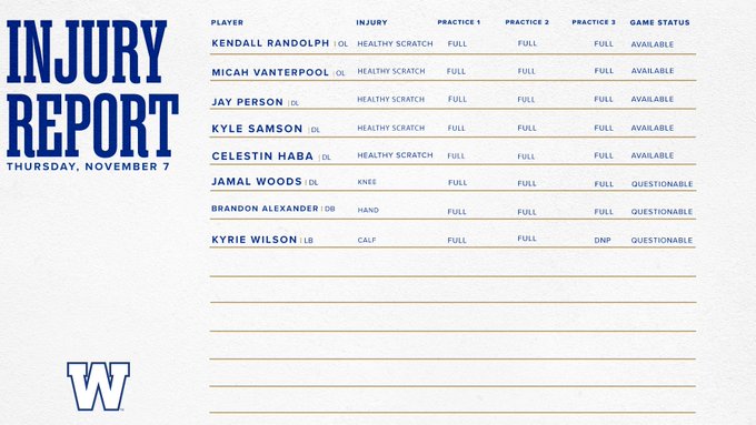 Winnipeg has also made a change along the defensive line, moving defensive tackles Jamal Woods and Devin Adams to the one-game injured list. Miles Fox will start alongside Jake Thomas despite dressing for only three games during the regular season due to injury, making three defensive tackles.