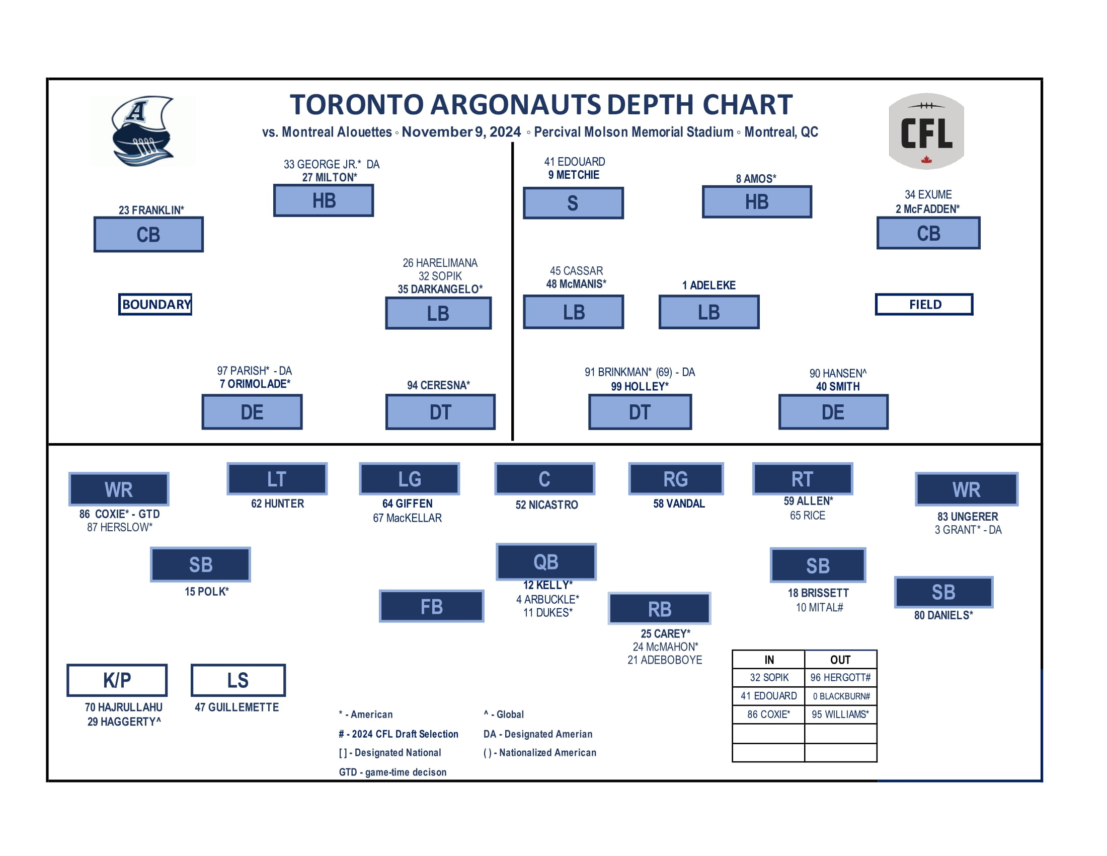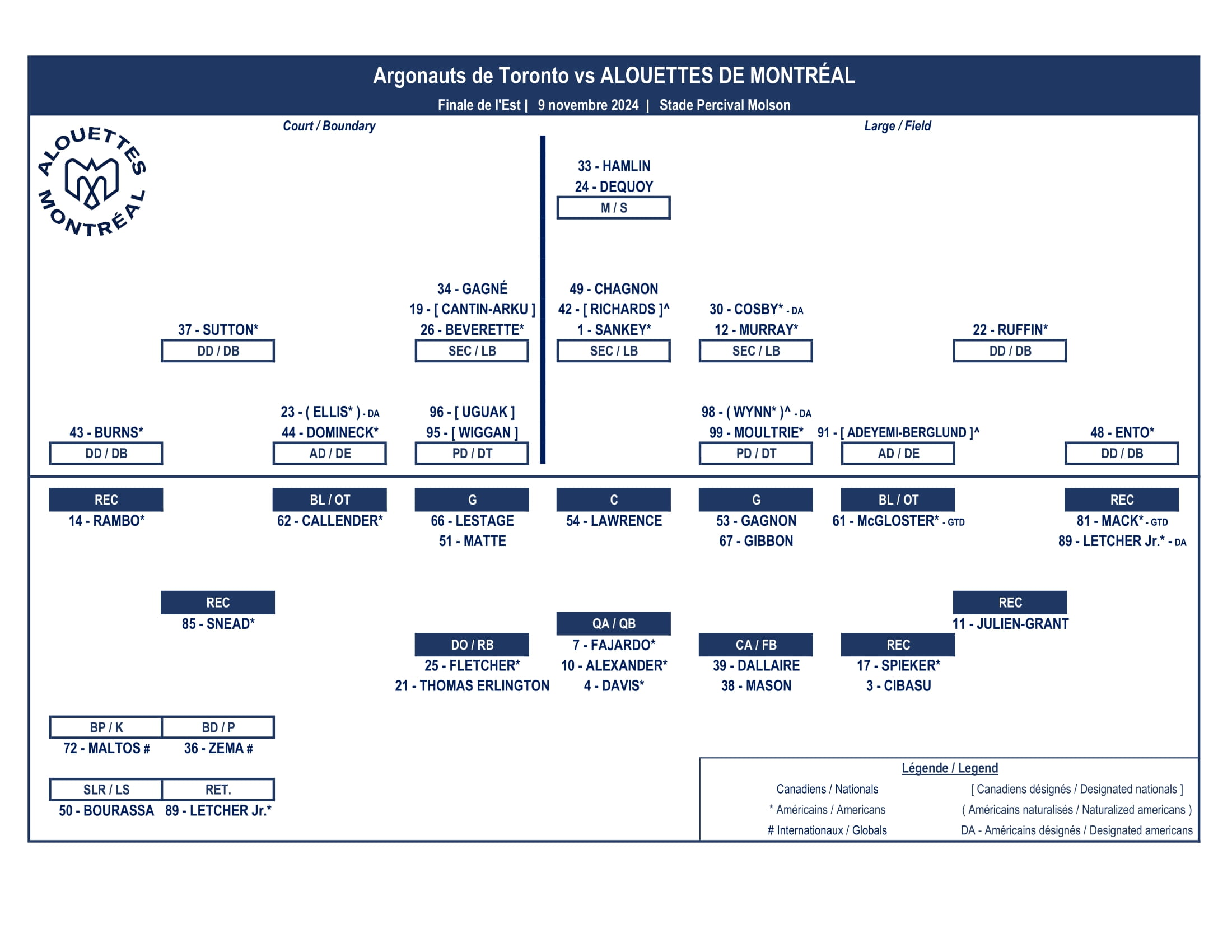 Back in action for the Alouettes after sitting out the regular season finale are  trio of Canadians — linebacker Frederic Chagnon, offensive lineman Kristian Matte, and defensive end Isaac Adeyemi-Berglund — as well as American returner James Letcher Jr. American offensive lineman Donny Ventrelli has been returned to the practice roster, while Canadian defensive end Brock Gowanlock, offensive lineman Theo Grant, receiver Nate Behar, and American returner Tyjon Lindsey have been made healthy scratches.