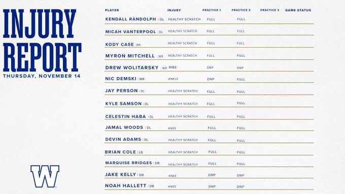 Injury-wise we are in, arguably, the best shape we've been in all year.  The Injury Report for November 14th is...