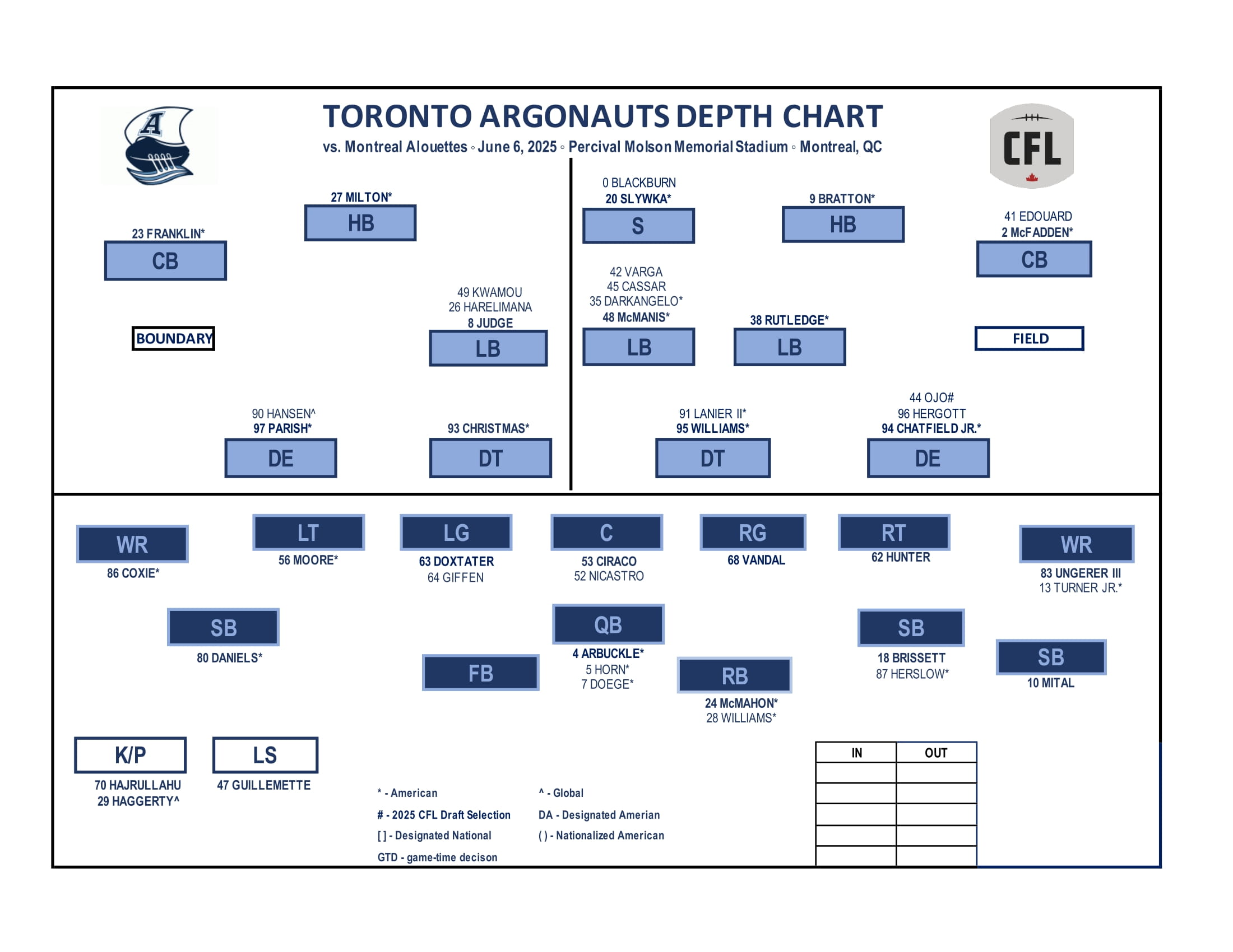 The Argonauts will begin their season on Friday, June 6 against the Montreal Alouettes. Kickoff is scheduled for 7:30 p.m. EDT at Percival Molson Stadium.