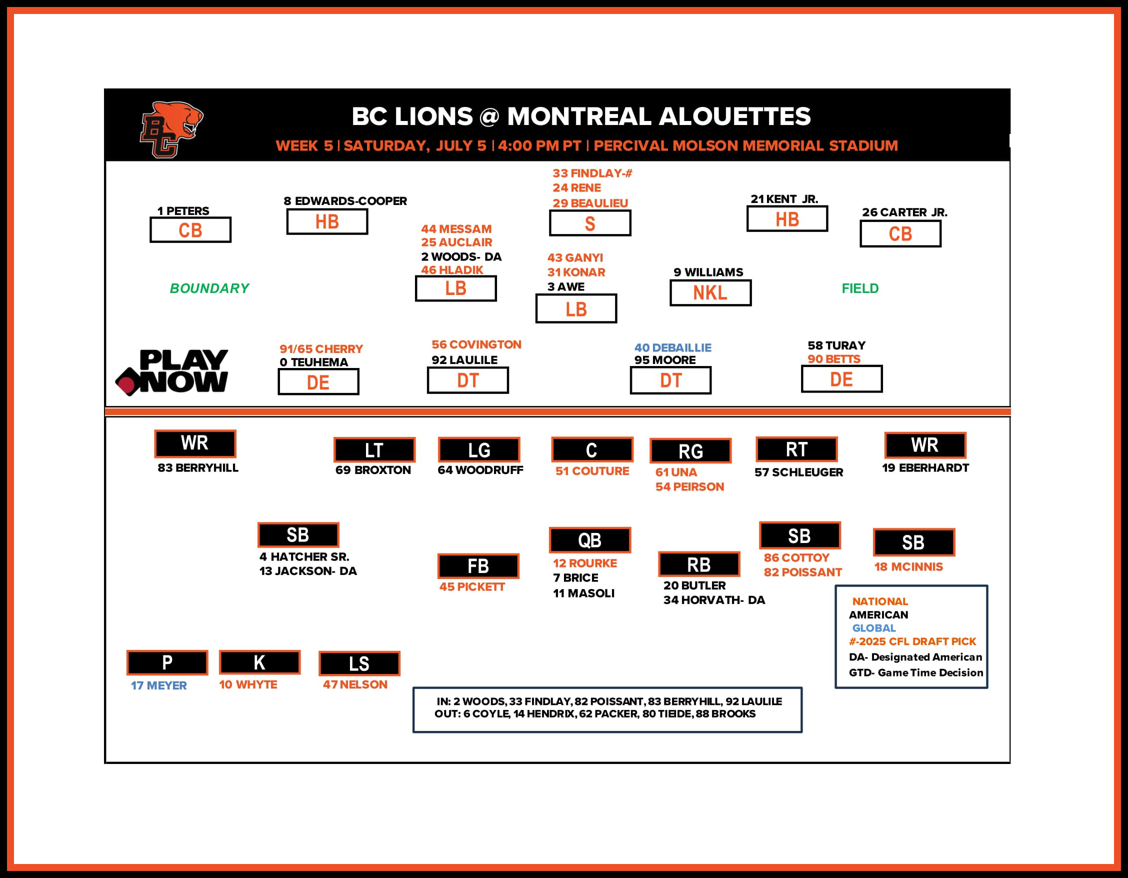 The B.C. Lions (1-3) will visit the Montreal Alouettes (3-1) at Percival Molson Stadium on Saturday, July 5 with kickoff slated for 7:00 p.m. EDT. The weather forecast calls for a high of 25 degrees with a mix of sun and clouds and a 30 percent chance of showers.
