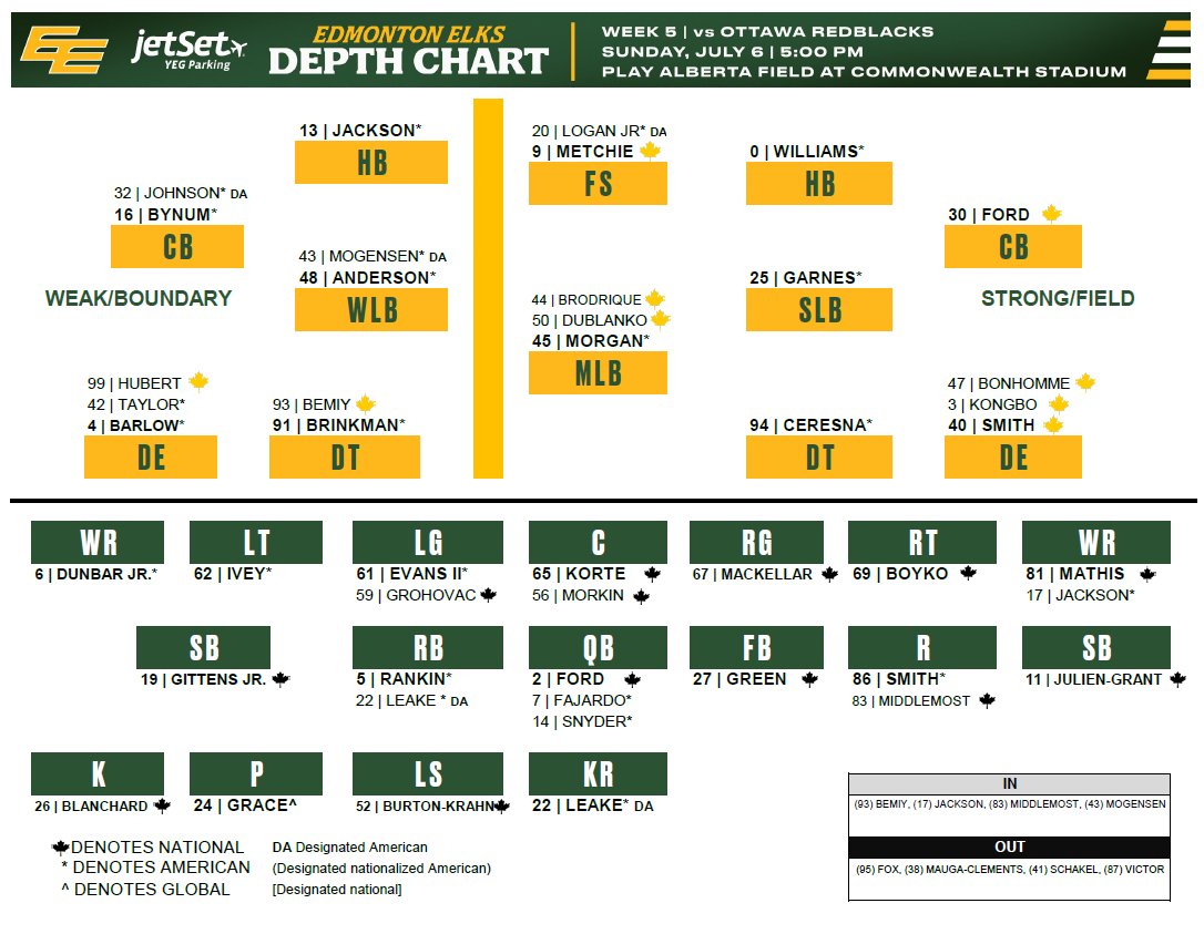 Former first-round CFL Draft pick Francis Bemiy will make his debut on the Elks' defensive line as a result of the changes, while veteran Canadian receiver Tyson Middlemost and rookie American linebacker Brock Mogensen will suit up for special teams depth. Former Georgia standout Kearis Jackson will dress in place of Victor as the extra American receiver.