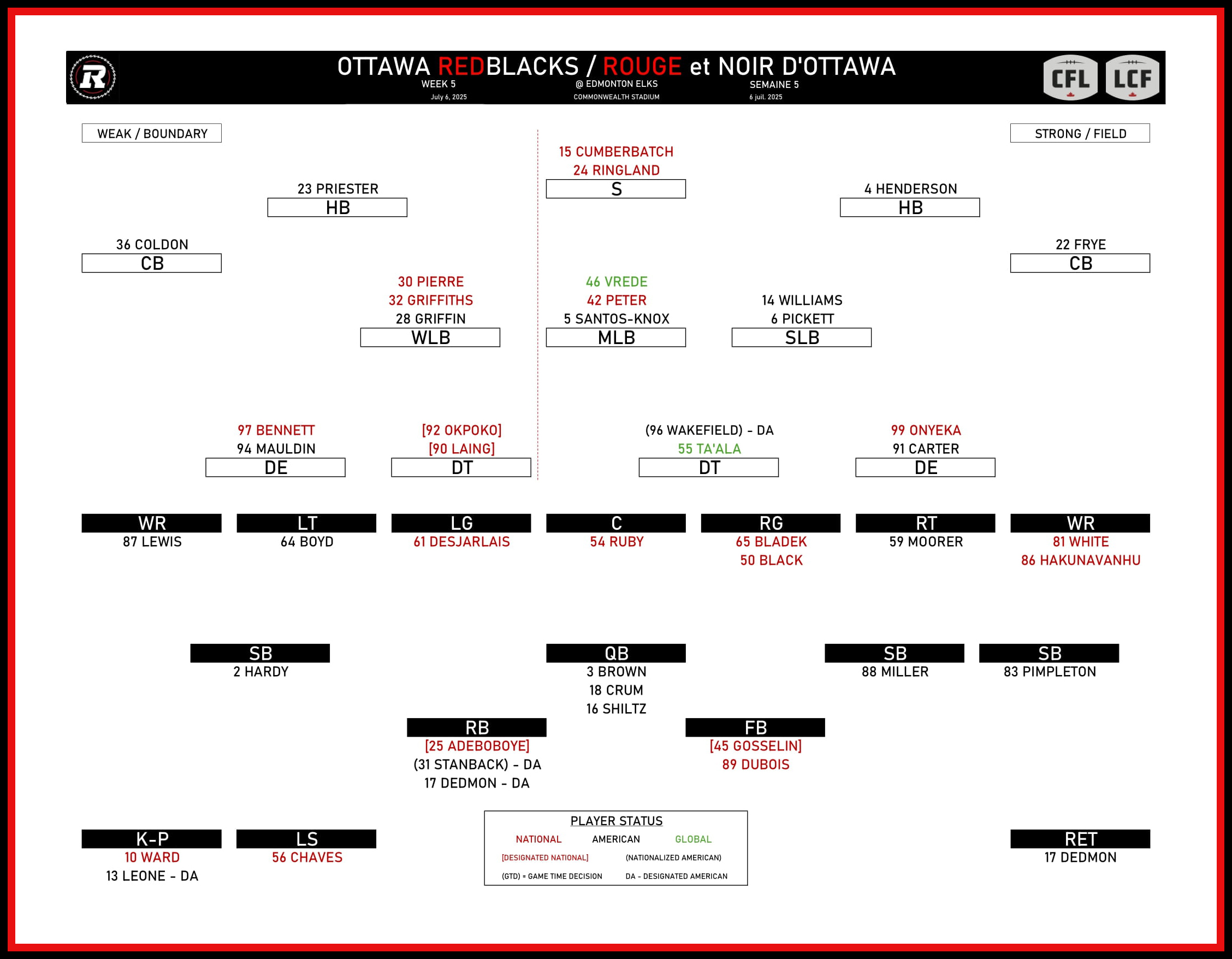 The most notable absence is Global linebacker Eteva Mauga-Clements, who was placed on the one-game injured list with a knee issue. The native of American Samoa was drafted first overall in the 2024 CFL Global Draft and has recorded 11 special teams tackles in 20 career games, including three so far this season.