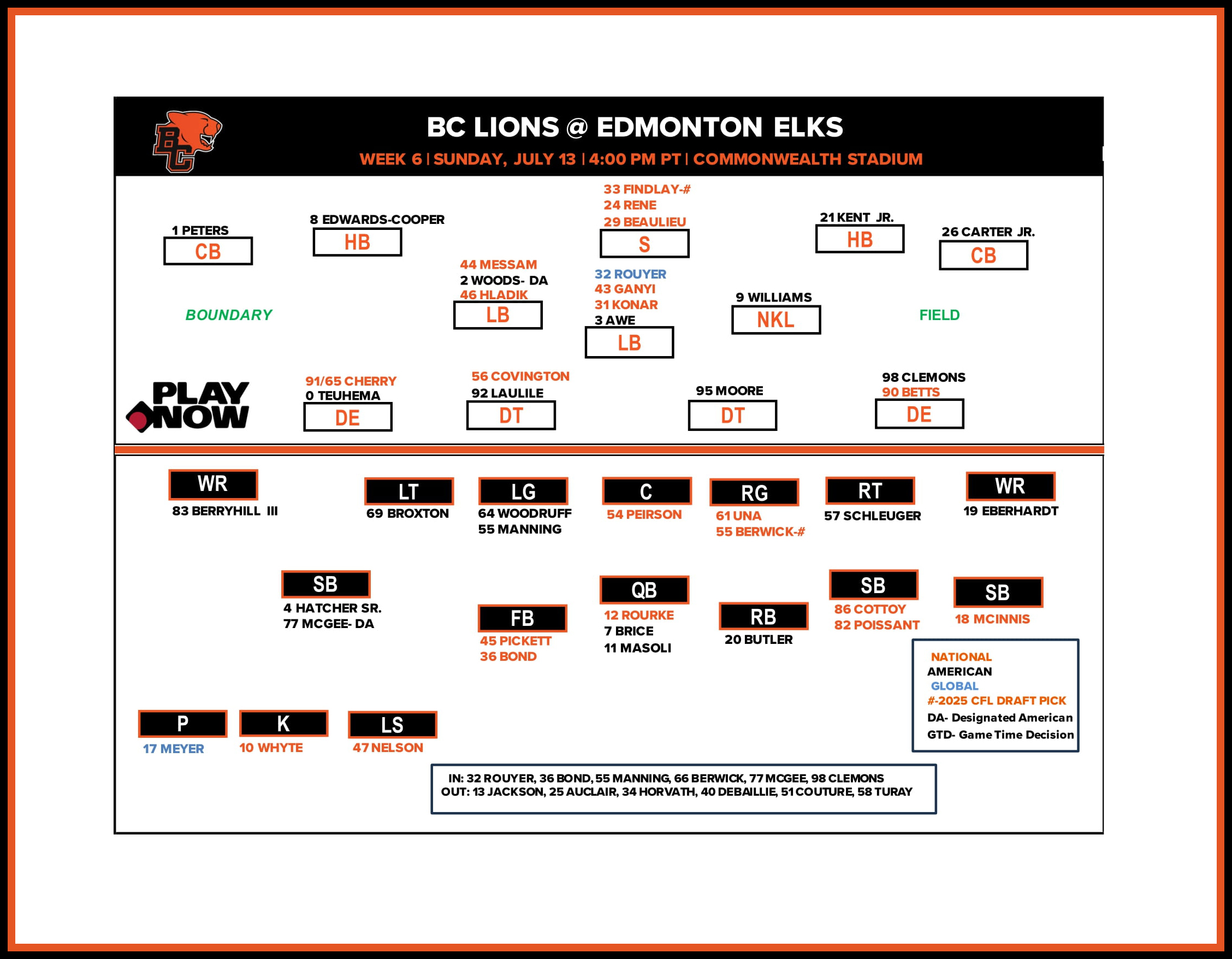 B.C. has also elected to make a change at returner, as Jermaine Jackson will be a healthy scratch this week and Seven McGee draws onto the roster after recovering from a thigh injury.