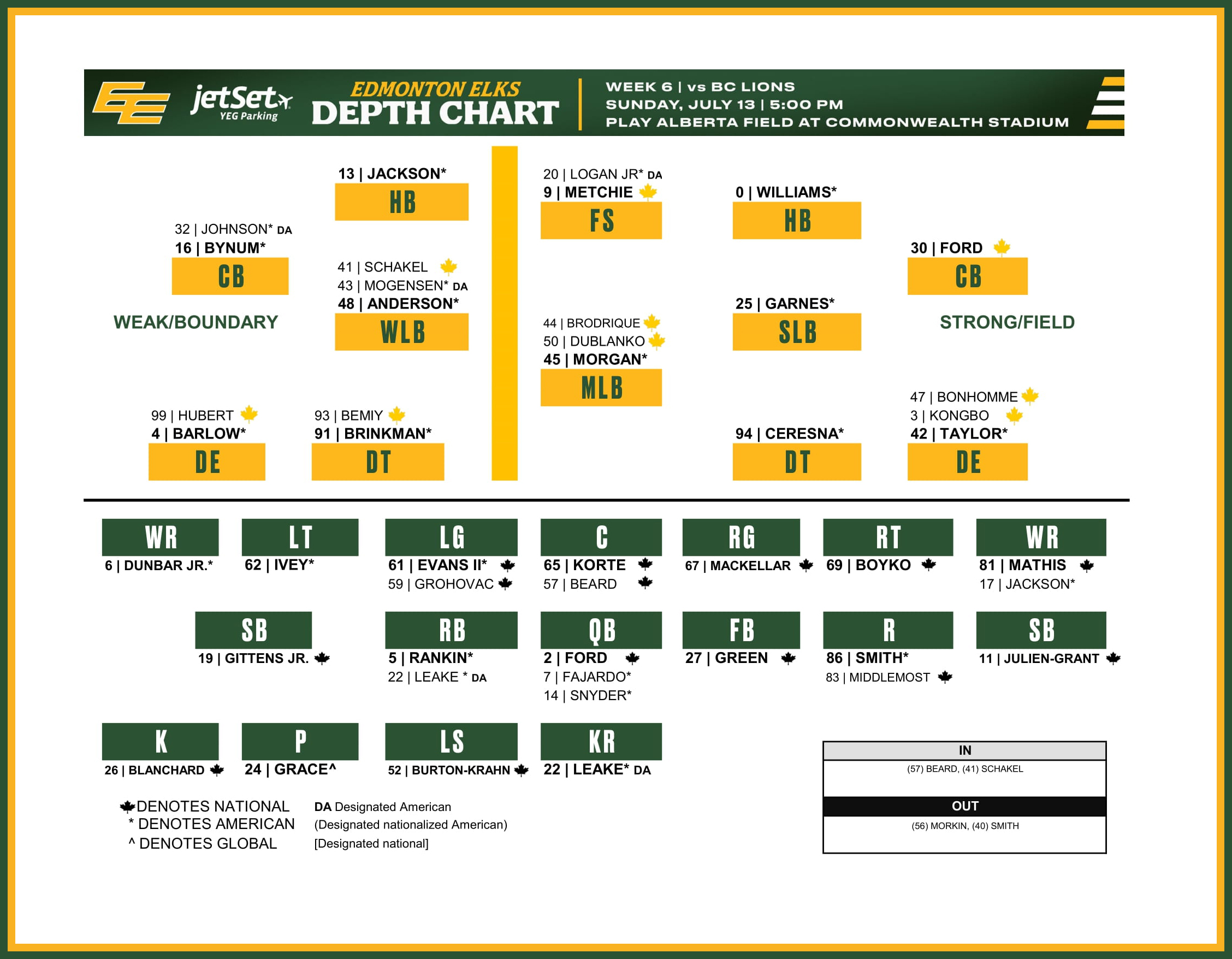 American Noah Taylor, who has recorded six defensive tackles and a sack this year, will get the start opposite Brandon Barlow. Canadian linebacker Josih Schakel has been activated for special teams depth and to fill out the ratio.
