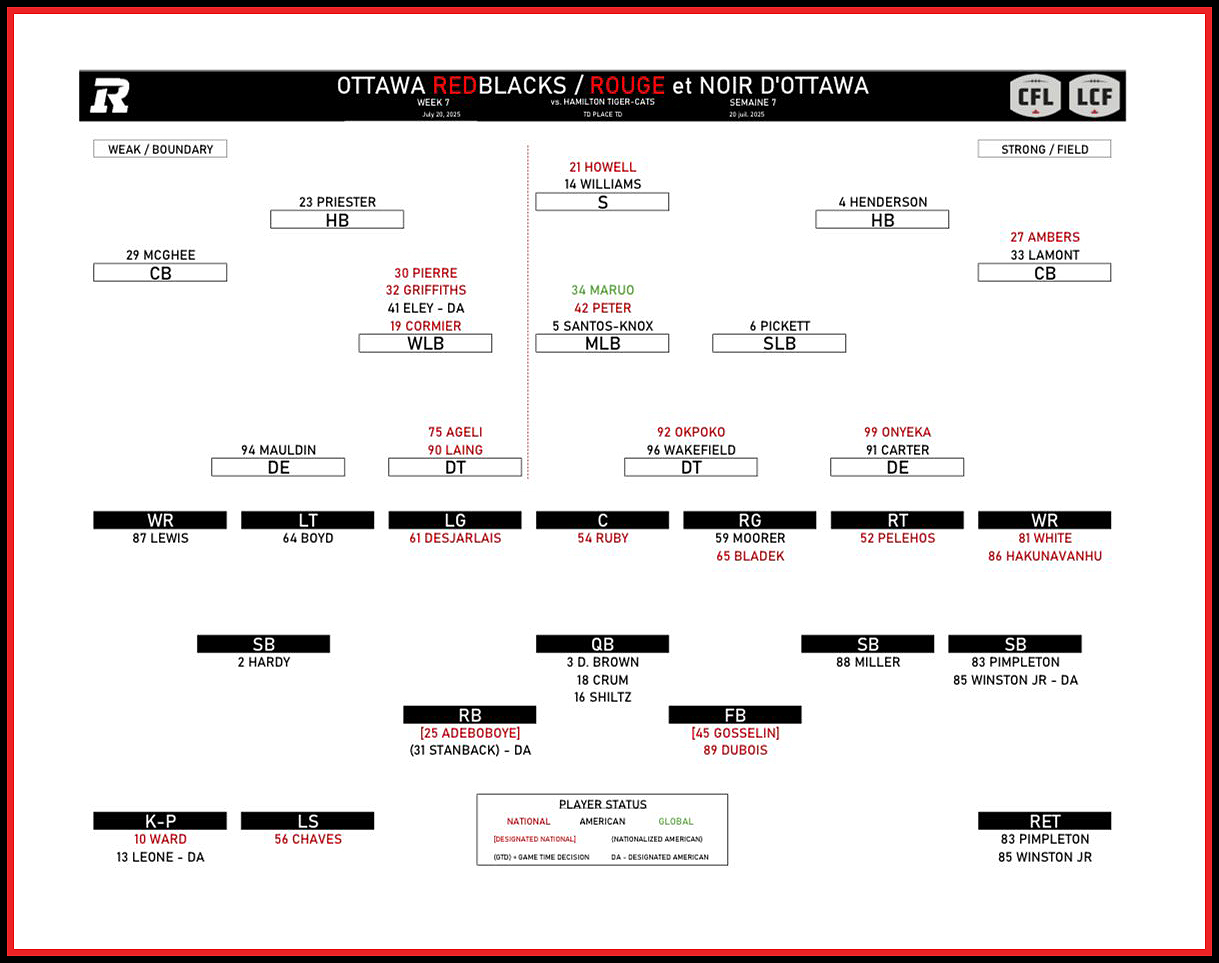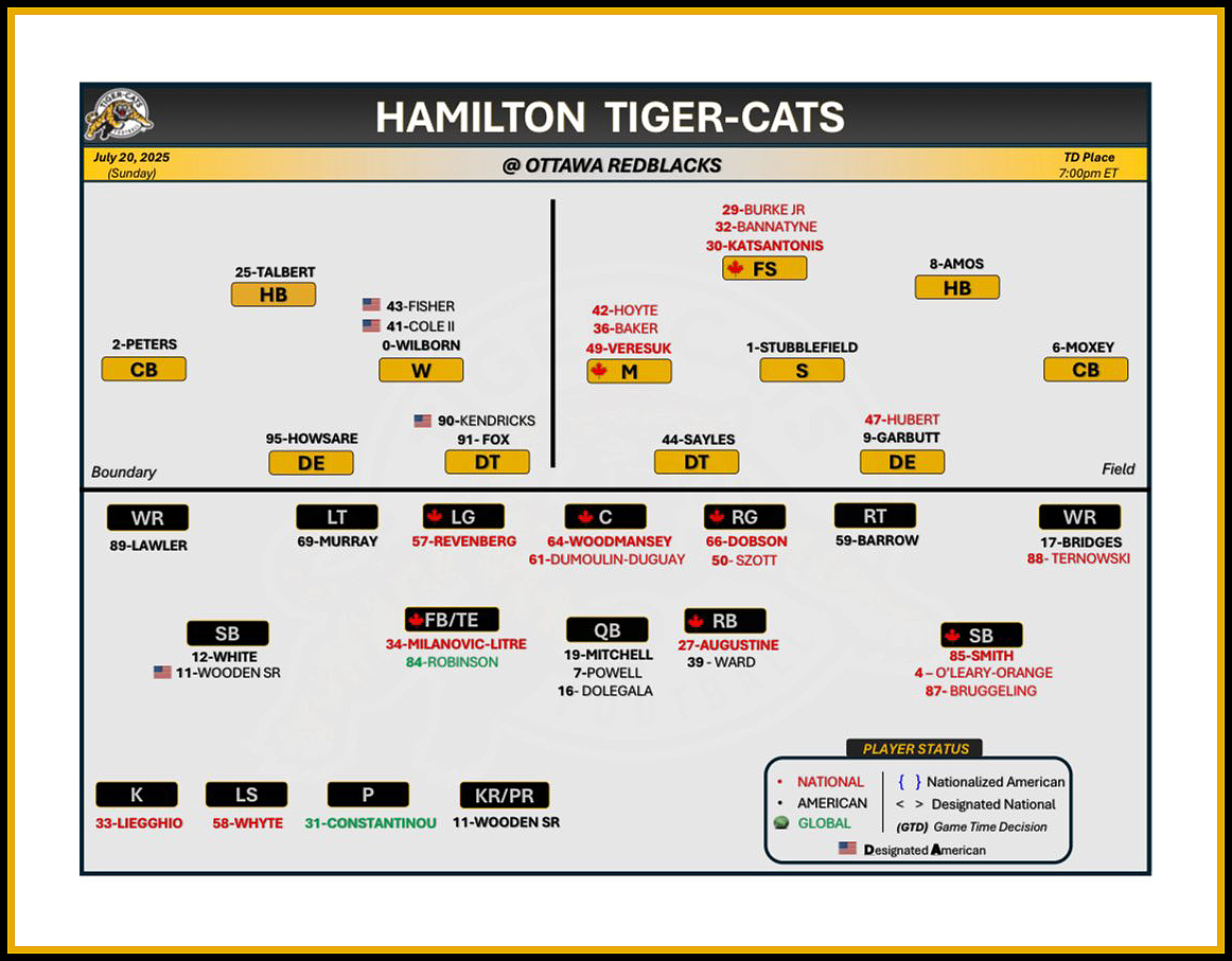 Alijah McGhee will slot in at the boundary after dressing as a backup last week. Deandre Lamont, who racked up 86 defensive tackles, five special teams tackles, and one interception in 2024, will make his season debut to the field after recovering from a hamstring injury. Veteran Canadian safety Justin Howell is also returns as insurance, sending rookie Eric Cumberbatch to the practice roster.