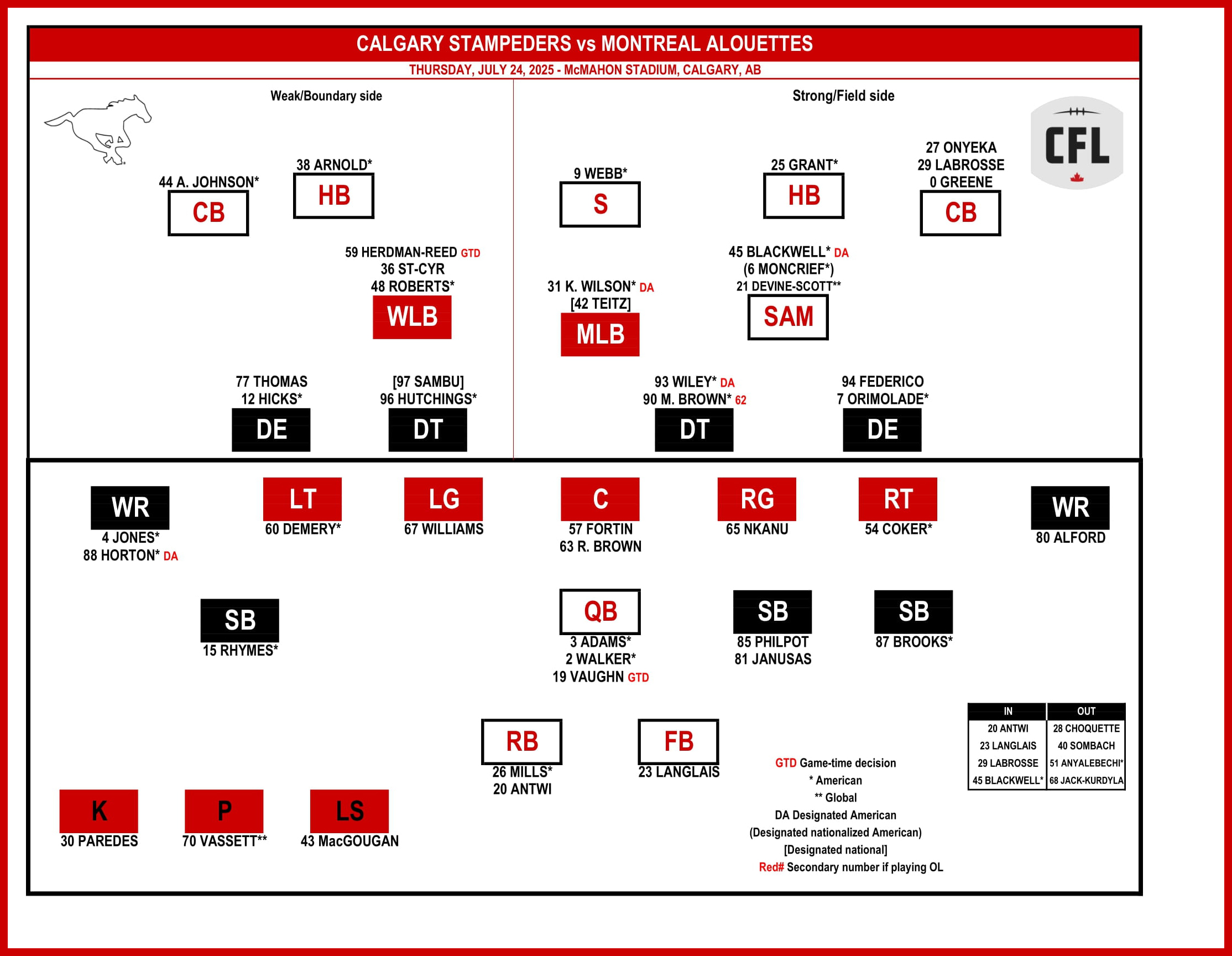 The Montreal Alouettes (4-2) will visit the Calgary Stampeders (5-1) at McMahon Stadium on Thursday, July 24 with kickoff slated for 9:00 p.m. EDT. The Alouettes are coming off a come-from-behind win over the Toronto Argonauts, while the Stampeders blew out the Winnipeg Blue Bombers last week.