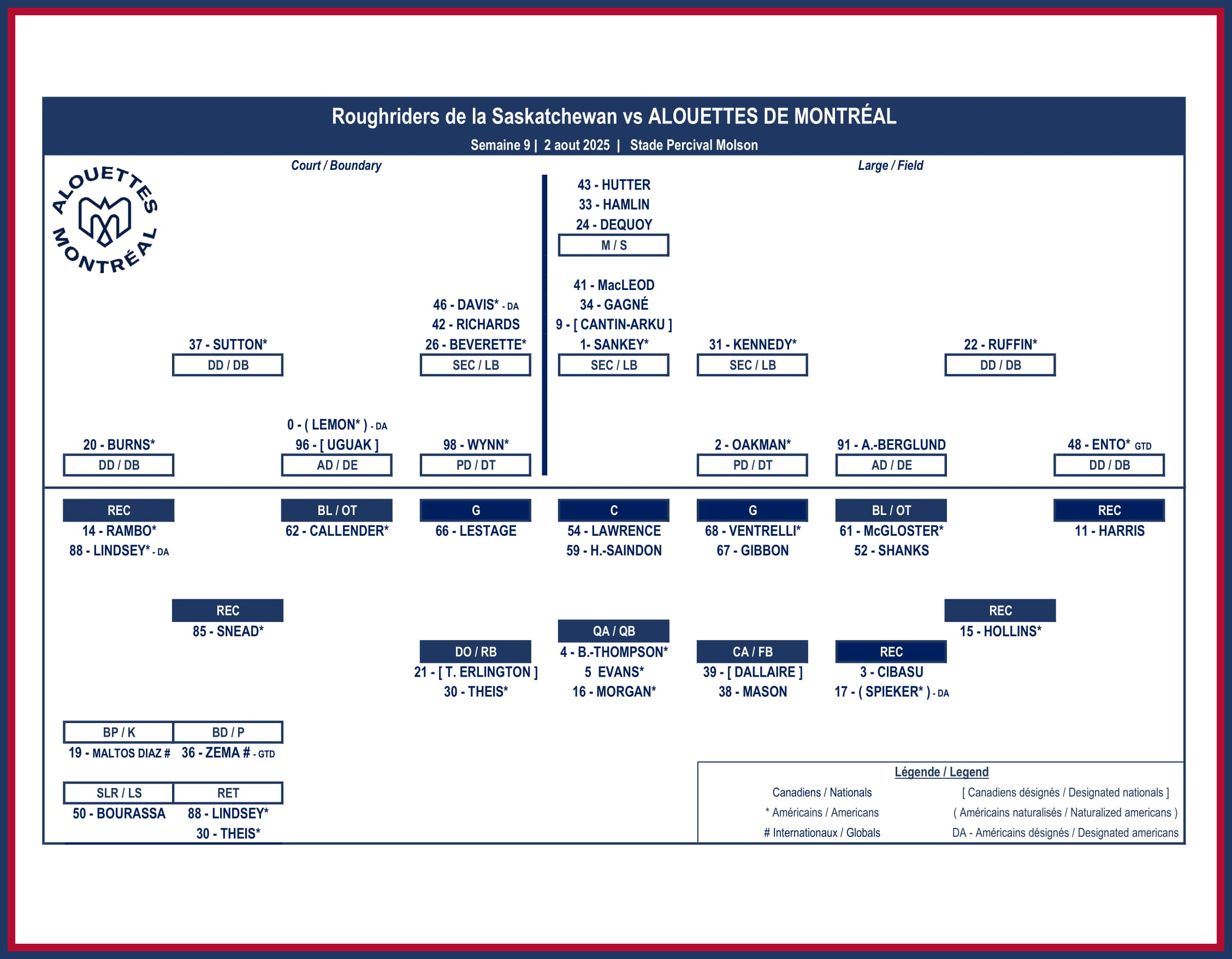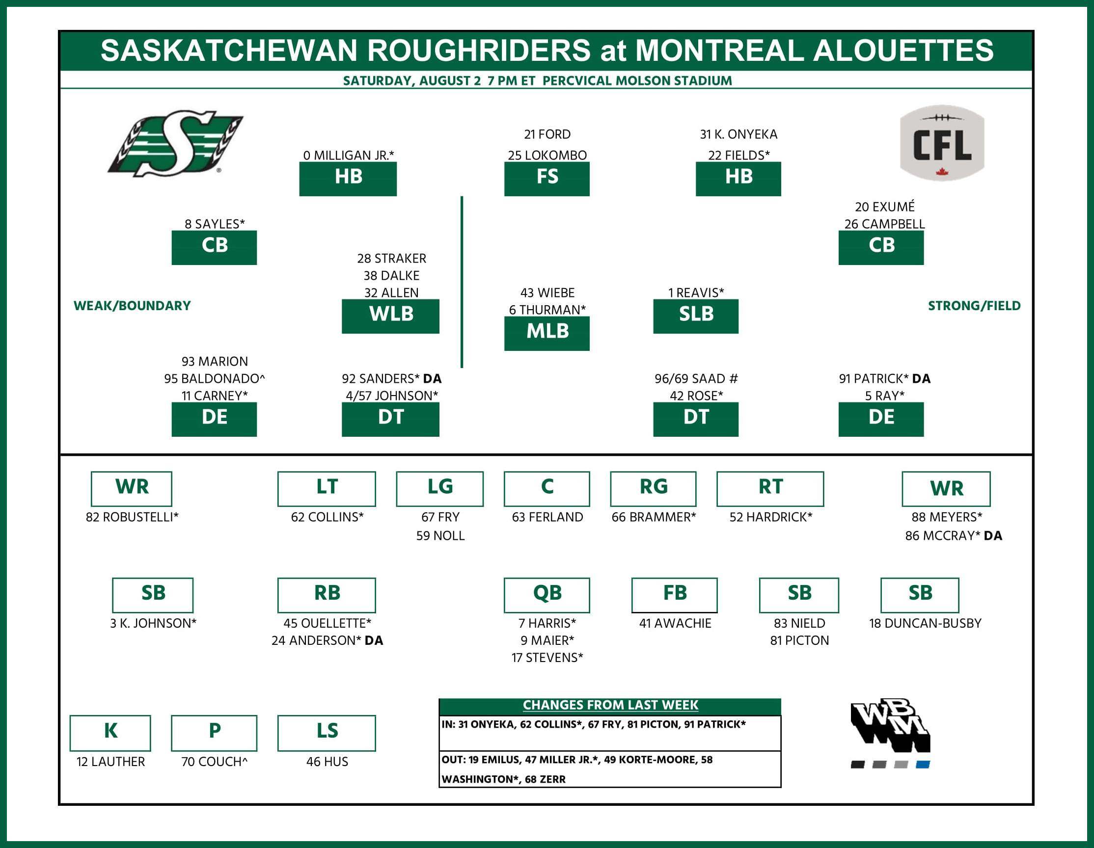 The Montreal Alouettes (5-2) will host the Saskatchewan Roughriders (6-1) on Saturday, August 2 with kickoff slated for 7:00 p.m. EDT. The Roughriders are coming off a 21-18 win over Edmonton, while the Alouettes completed a comeback victory over the Stampeders in Calgary.