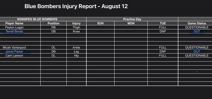 Stay tuned for Blue Bomber and Red Blacks updates including depth charts and injury updates when released.