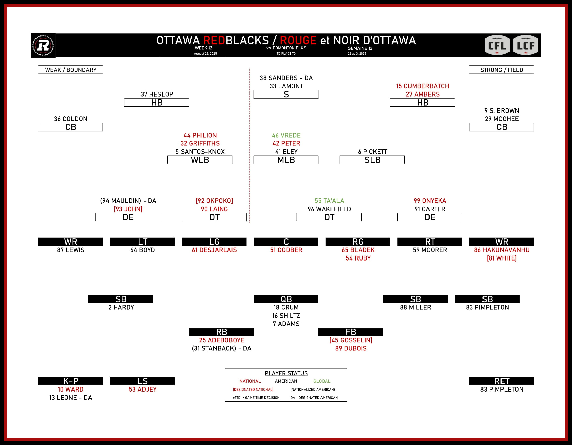 Alijah McGhee returns from injury to resume his field corner spot, allowing Gavin Heslop to move to boundary halfback. Deandre Lamont bumps to safety, while Canadian rookie King Ambers makes his first career start at field halfback. Only boundary corner C.J. Coldon remains in the same slot as last week, with Shakur Brown, Bentlee Sanders, and Canadian rookie Eric Cumberbatch drawing in to provide depth.