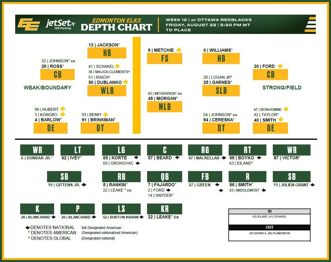 The weather forecast in Ottawa calls for a high of 27 degrees with a mix of sun and cloud. The game will be broadcast on TSN and RDS in Canada and CFL+ internationally. Radio listeners can tune-in on 880 CHED in Edmonton and TSN 1200 in Ottawa.
