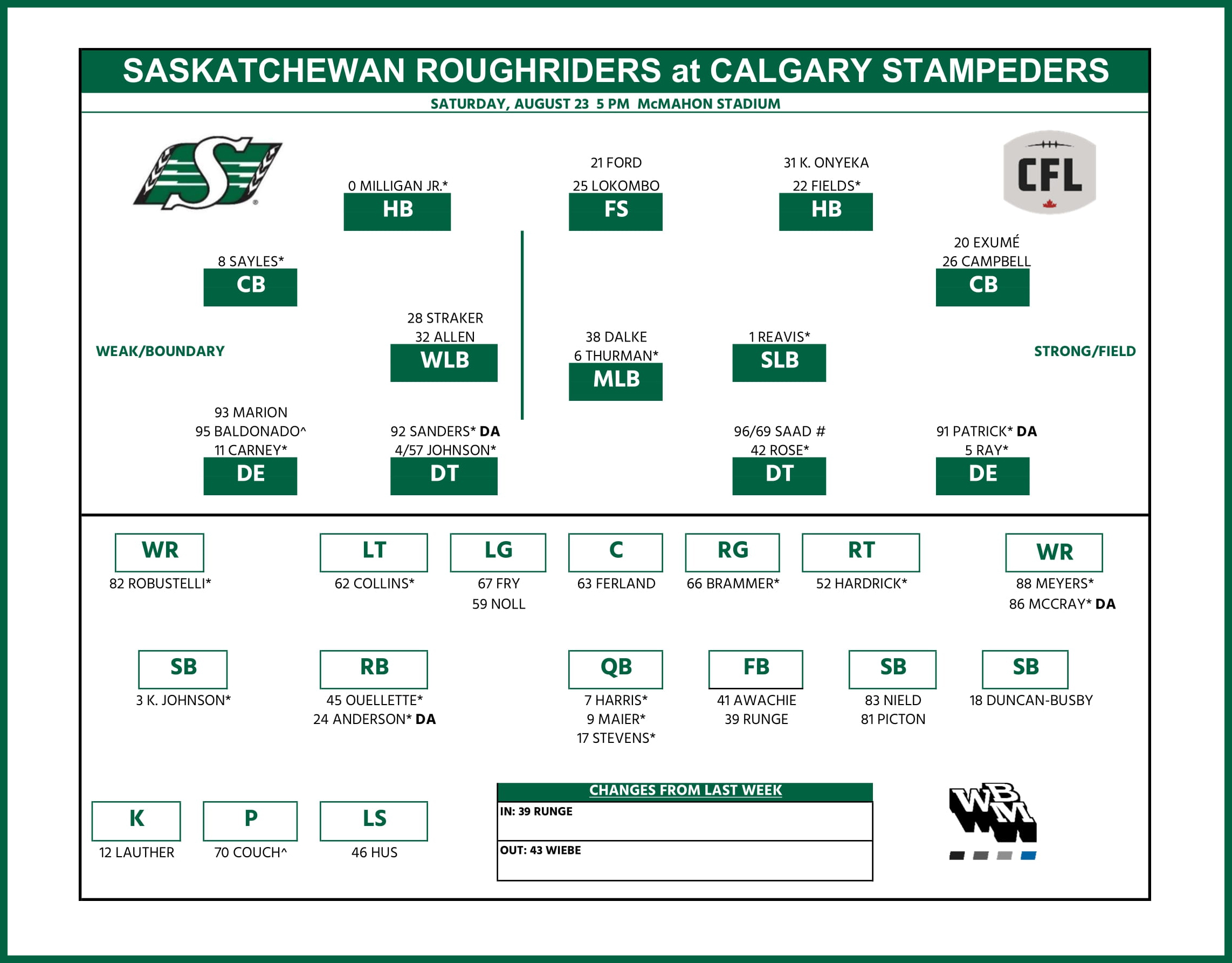 Saskatchewan Roughriders without top special teams tackler Nick Wiebe vs Calgary