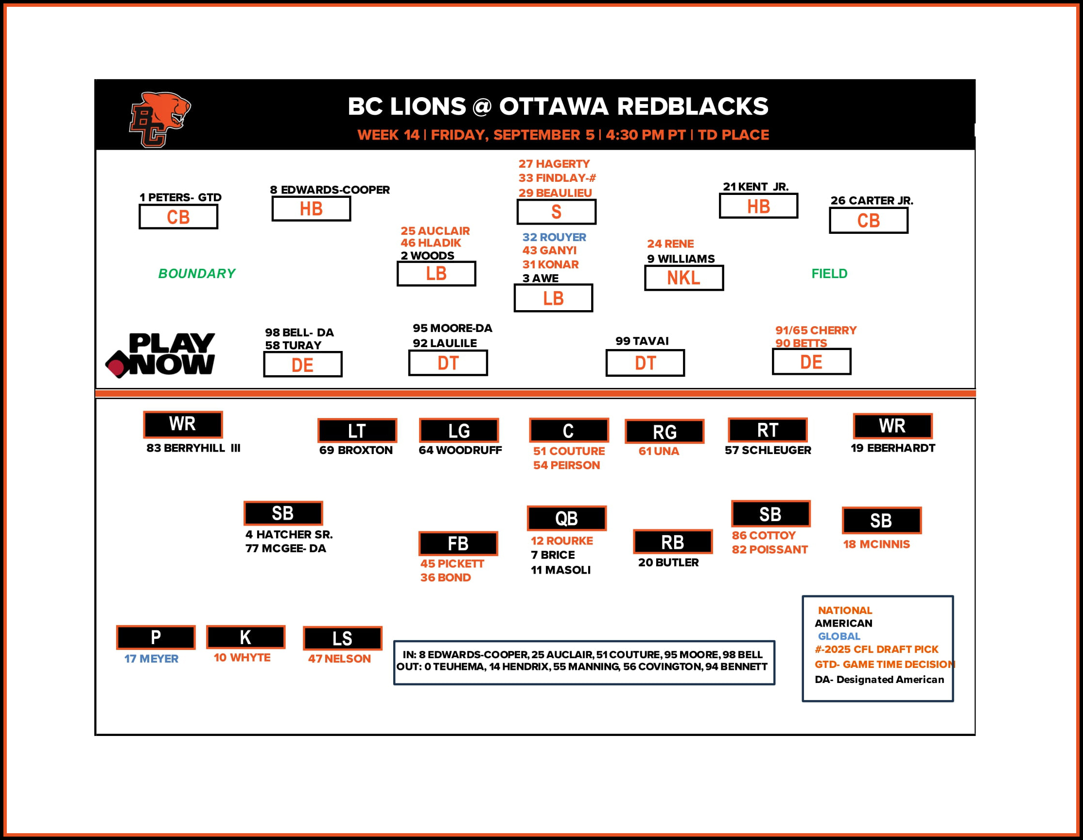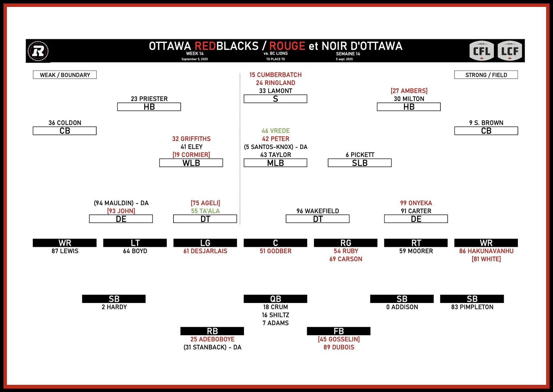 Centre Michael Couture is the most notable addition after the bye week, stepping back in with the starting unit after missing the last six games with a hand injury. His return bumps Andrew Peirson back into a backup role, while former first-round CFL Draft pick Anu Una has been promoted to starting right guard, and American Ilm Manning has been sent to the practice roster for ratio reasons.