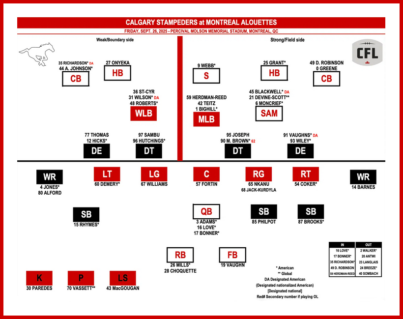 In corresponding moves, Calgary has moved quarterbacks Josh Love and Logan Bonner to the active roster, who will dress as the second and third-stringers behind Adams Jr., respectively. Tyler Richardson will dress as a backup cornerback after being a healthy scratch last week, while Canadian depth players Justin Herdman-Reed and Dolani Robinson have also been added to the active roster.