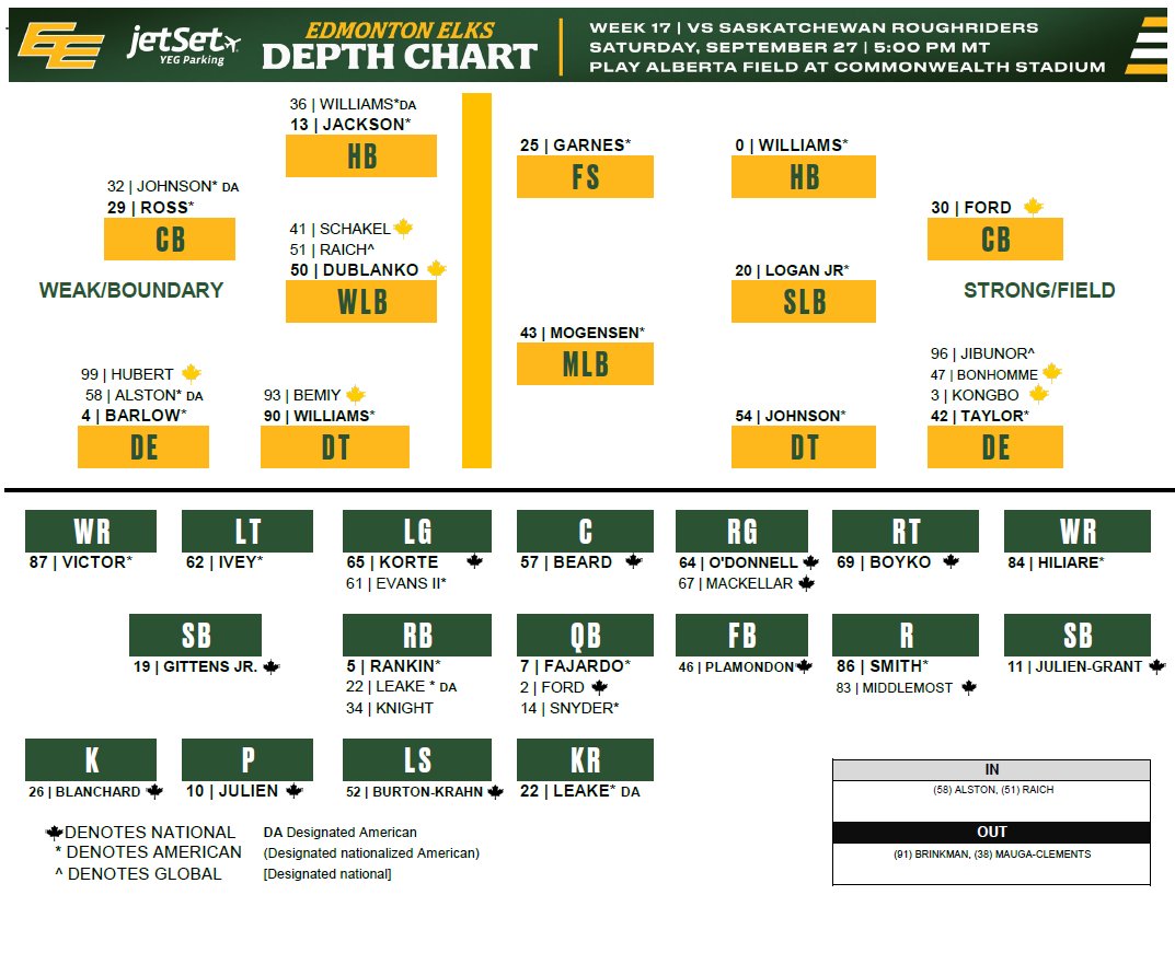 The Saskatchewan Roughriders (10-3) will visit the Edmonton Elks (5-9) on Saturday, September 27 with kickoff slated for 7:00 p.m. EDT. The Roughriders were on a bye this past week, while the Elks suffered a heartbreaking walk-off loss to the Hamilton Tiger-Cats.