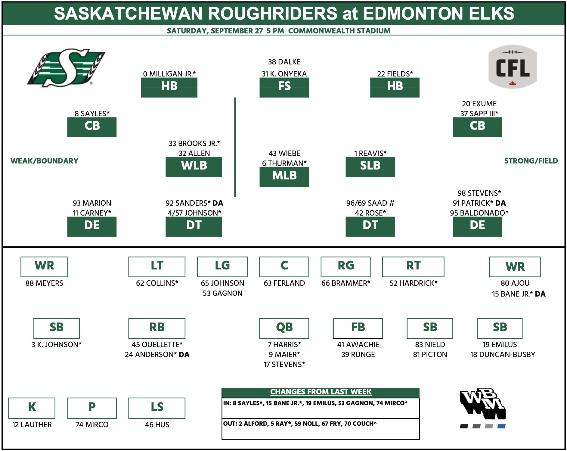 The Edmonton Elks (5-9) will host the Saskatchewan Roughriders (10-3) on Saturday, September 27 with kickoff slated for 7:00 p.m. EDT. The Roughriders were on a bye this past week, while the Elks suffered a heartbreaking walk-off loss to the Hamilton Tiger-Cats.